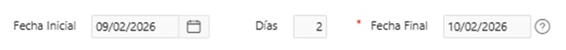 Fecha Final: se genera automáticamente según la fecha inicial y cantidad de días previamente indicados.