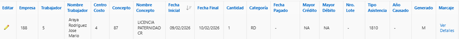 Días: Indicar la cantidad de días otorgada, para la licencia de paternidad son 8 días. Esta licencia se distribuye en dos días por semana durante las primeras 4 semanas posteriores al nacimiento del hijo.