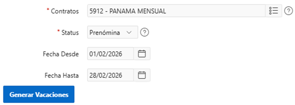 - Contratos: Se debe seleccionar el contrato a efectuar el cálculo de vacaciones.