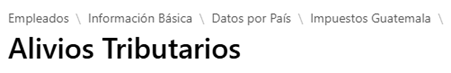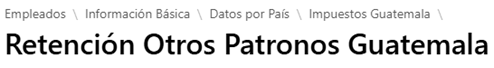 Para registrar los datos de los expatronos u otros patronos se debe ingresar a las opciones “Alivios Tributarios” y “Retención Otros Patronos Guatemala” a través de la ruta Empleados / Información Básica / Datos por País / Impuestos Guatemala.