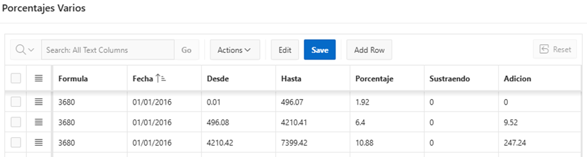Opción para registrar rangos de impuesto, ingrese a Porcentajes Varios. Configure parámetros: Fecha, Desde, Hasta, Porcentaje,