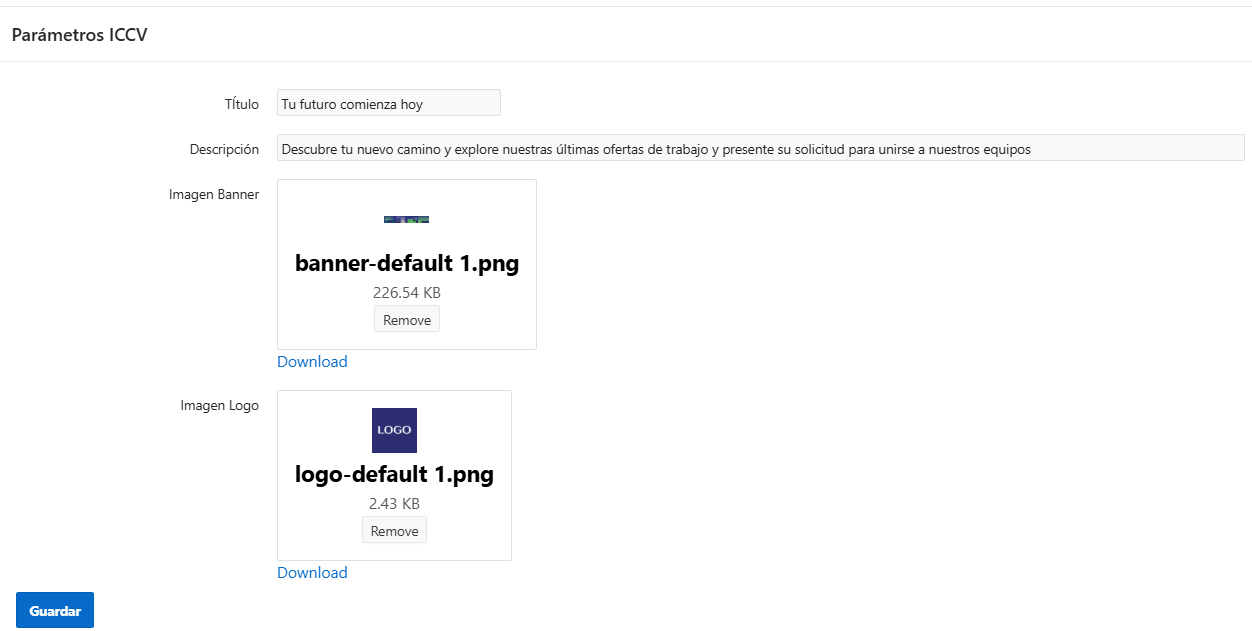 - Se debe definir los textos del Título y Descripción y cargar las imágenes del Logo y Banner que se desea mostrar.