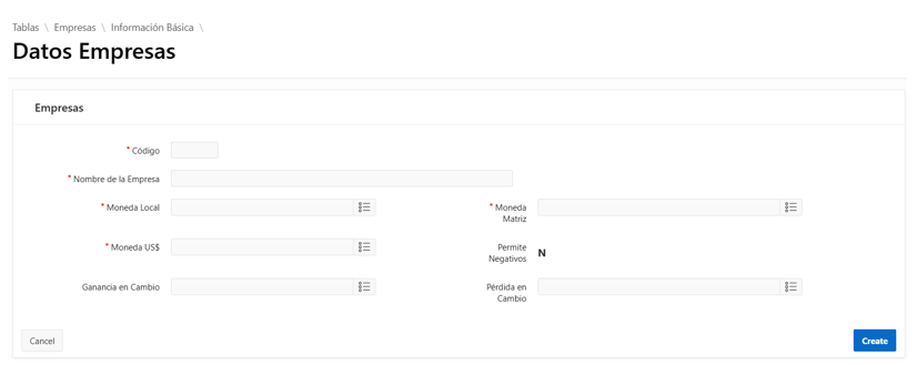 - Moneda Local: seleccionar la moneda de circulación del país donde está ubicada la empresa, el mismo está definido en el módulo MONEDAS. El nombre aparece por defecto.