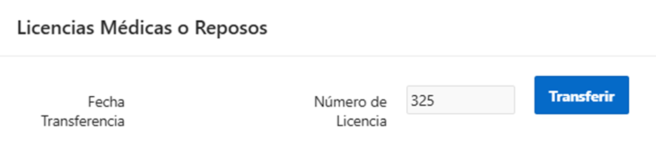 Luego de crear la Licencia Médica se asigna un Número de Licencia automático y se habilita un botón denominado TRANSFERIR.
