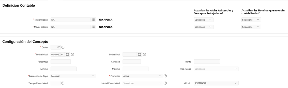 - Fecha Inicial: Indicar la fecha inicial que aplique a partir de cuando se pretende habilitar el concepto.