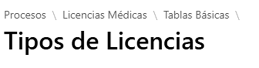 Una vez creado el concepto, el siguiente paso es crear la licencia en el módulo de Licencias Médicas, por lo que se debe ingresar a la ruta Procesos / Licencias Médicas / Tablas Básicas / Tipos de Licencias.
