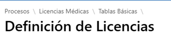 Luego, ingresar a la ruta Procesos / Licencias Médicas / Tablas Básicas / Definición de Licencias.