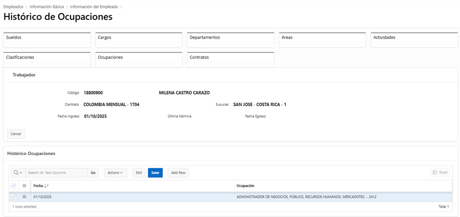 En Ocupaciones es posible validar todas las que se le han asignado al colaborador desde que ingresó a la empresa o asignarle una nueva.