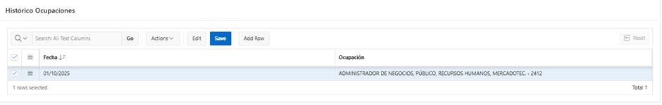 Para registrar una ocupación se debe dar clic al botón ADD ROW, ingresar la fecha desde la cual va a regir esa ocupación, luego seleccionar la ocupación dentro de la lista de valores, y por último dar clic al botón SAVE.
