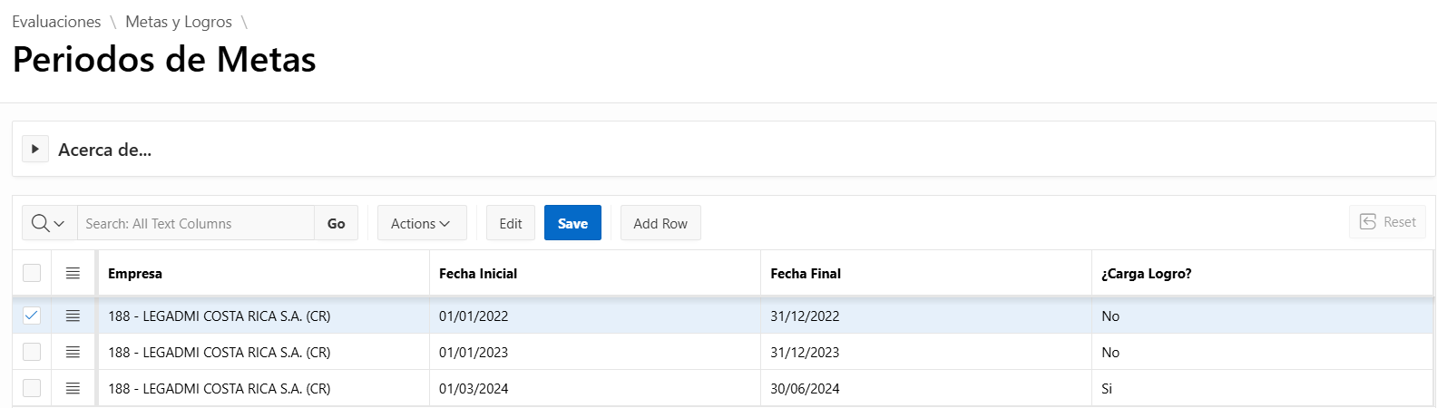 Pantalla para establecer y administrar los períodos de tiempo durante los cuales se fijarán, medirán y evaluarán las metas asignadas a cada trabajador.
