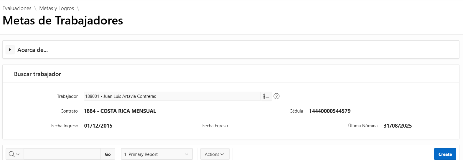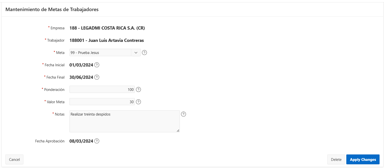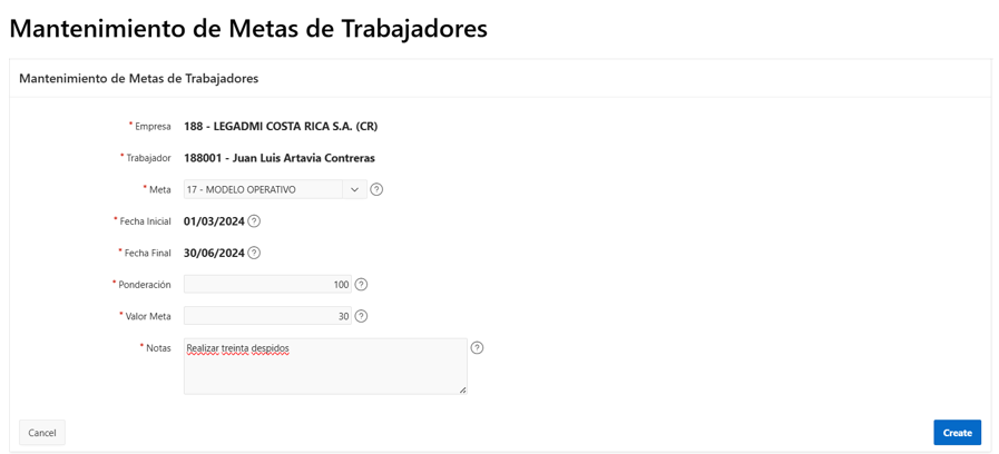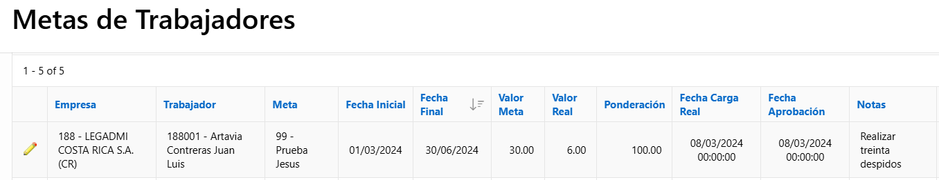 En esta pantalla se podrá consultar, crear, editar o eliminar las metas de los trabajadores que pertenecen a la empresa.