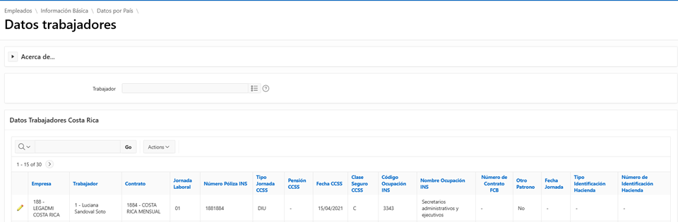 Ingresar a la ruta: Empleados / Información Básica / Datos por País / Datos Trabajadores Costa Rica.
