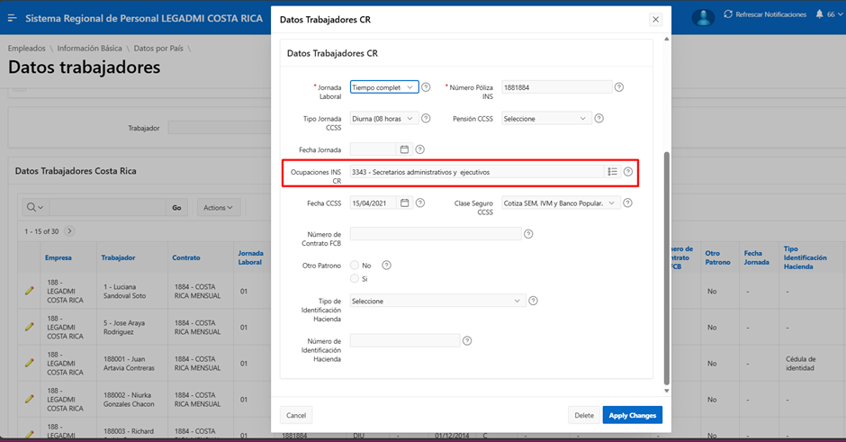 Para registrar la ocupación INS, ingrese a Datos Trabajadores Costa Rica, seleccione el trabajador, edite, elija la ocupación en Ocupaciones INS CR y aplique cambios.