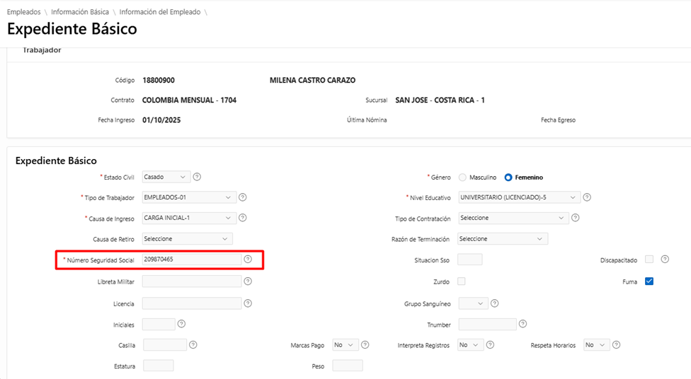 Una vez dentro del Expediente, se debe seleccionar la opción de Expediente Básico y buscar el parámetro llamado Número Seguridad Social.