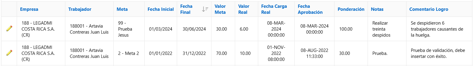 En esta pantalla se pueden ver únicamente las metas aprobadas de los trabajadores que pertenecen a la empresa con la cual se inicio sesión.