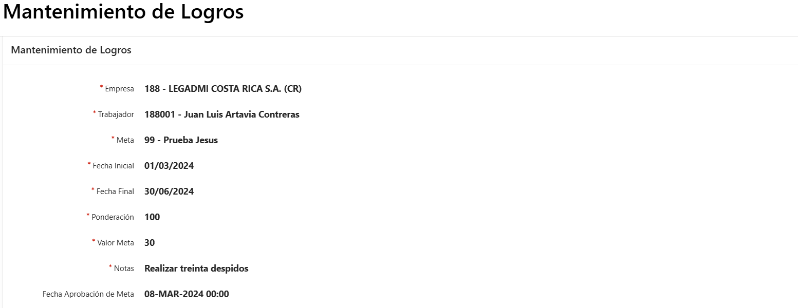2. El sistema despliega una pantalla para el mantenimiento de logros con la información general de la meta ya registrada. La información que se mostrará por defecto es: