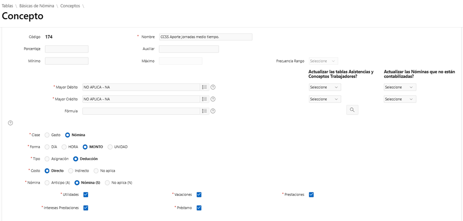 Configurar aportaciones patronales CCSS medio tiempo creando concepto, configuración por contrato, tabla de antigüedad y validar condiciones de cálculo.