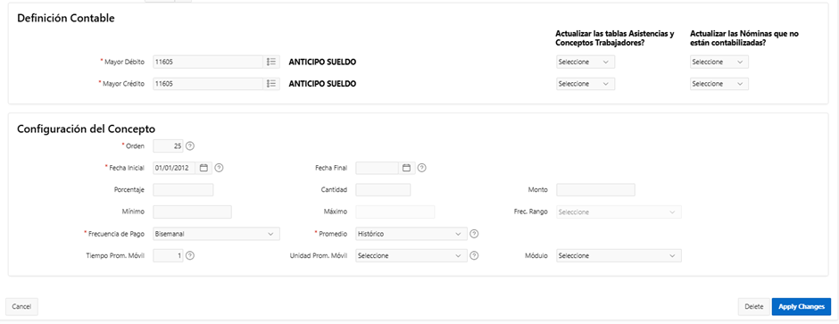 - Fecha Inicial: Indicar la fecha inicial que aplique a partir de cuando se pretende habilitar el concepto.