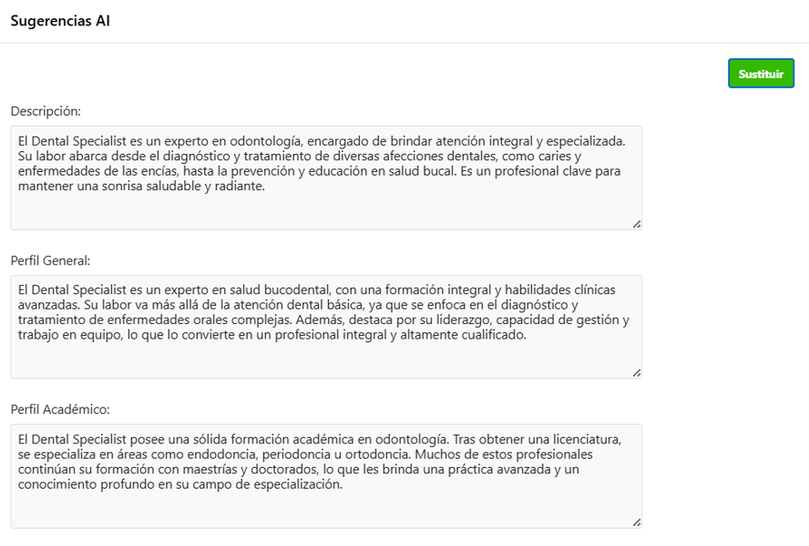 - Dando click al botón ¨Utilizar AI¨, muestra la documentación sugerida para el cargo seleccionado
