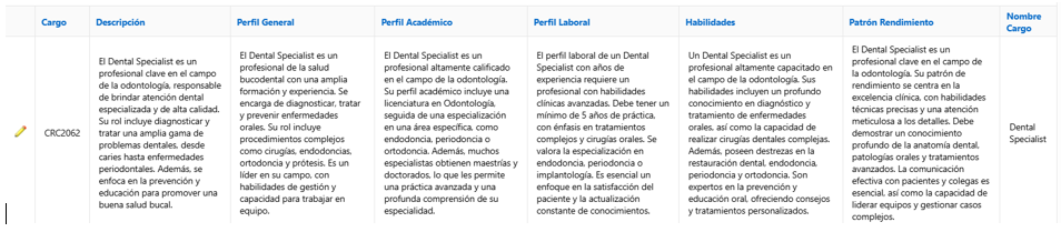 Pantalla que permite gestionar y mantener la información detallada de las descripciones de cada cargo en la organización, incluyendo sus responsabilidades, requisitos y competencias.