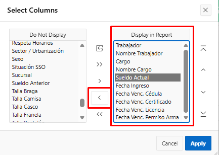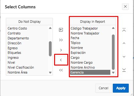 - Seleccione las columnas que desea agregar y eliminar del reporte.