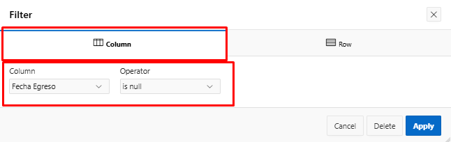 - Se selecciona filtrar por columna y en la columna se selecciona "Fecha Egreso" y en Operador seleccione "is null".