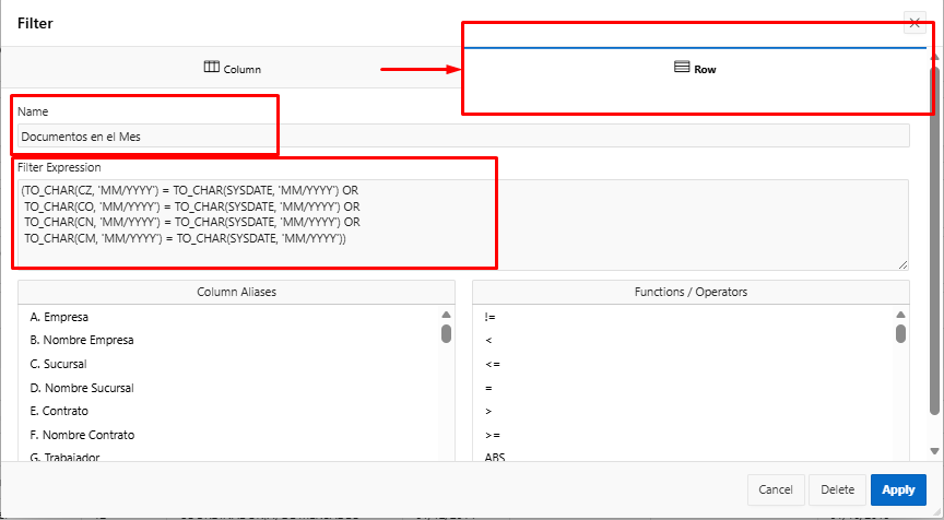 - En el apartado Fila, dentro de Expresión de Filtro: