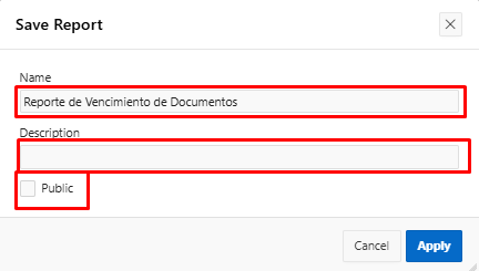 - Público: Active el check si desea que otros usuarios puedan acceder a este reporte