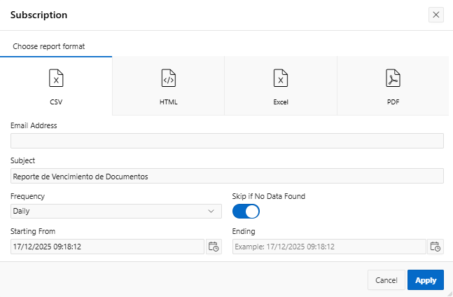 - Formato del reporte: Seleccione entre CSV, HTML, Excel o PDF